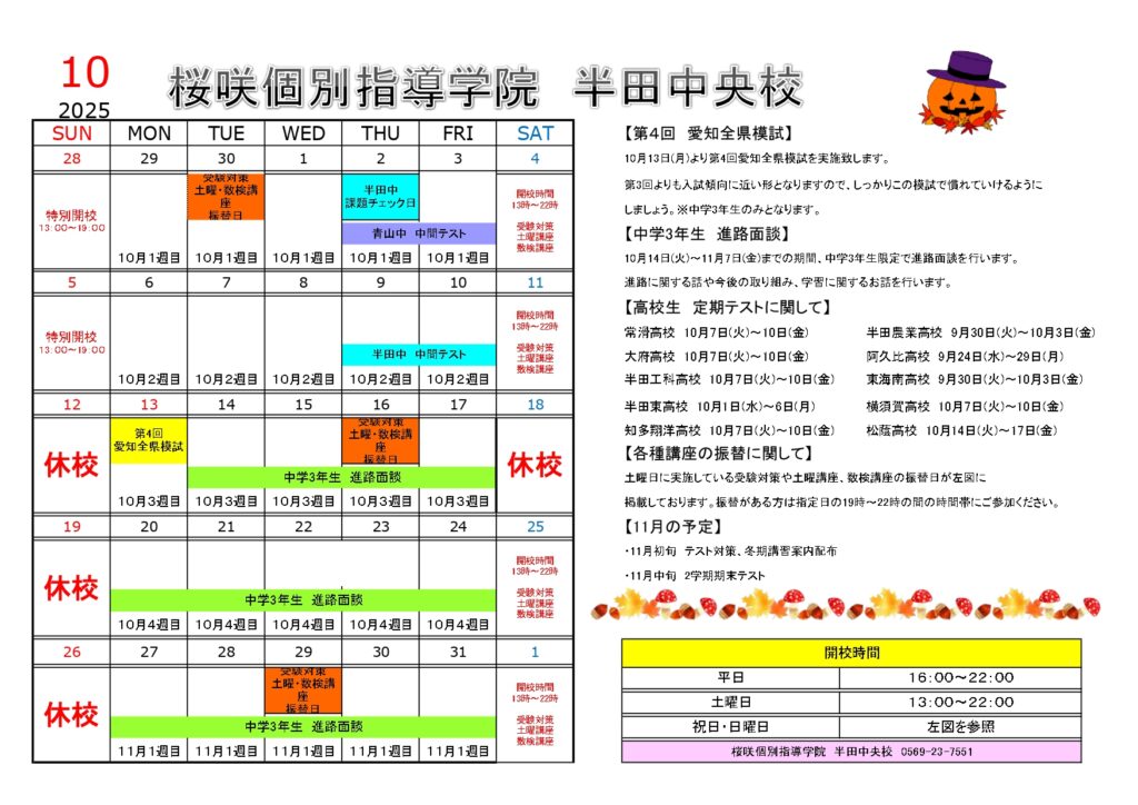 【半田中央校】10月度📅カレンダー 是非ご確認ください‼
