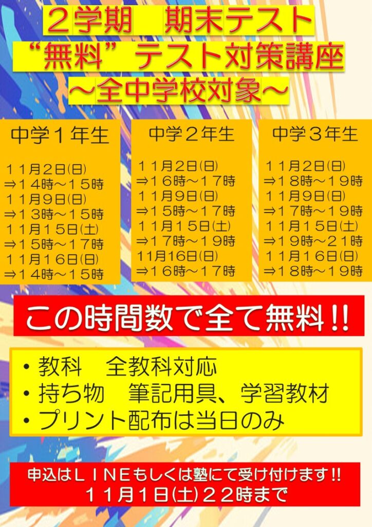 2学期期末テスト無料テスト対策講座のご案内です。
